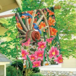 Wagon Wheel Floral Spring House Flag Bluebirds 28″ X 40″ Briarwood Lane